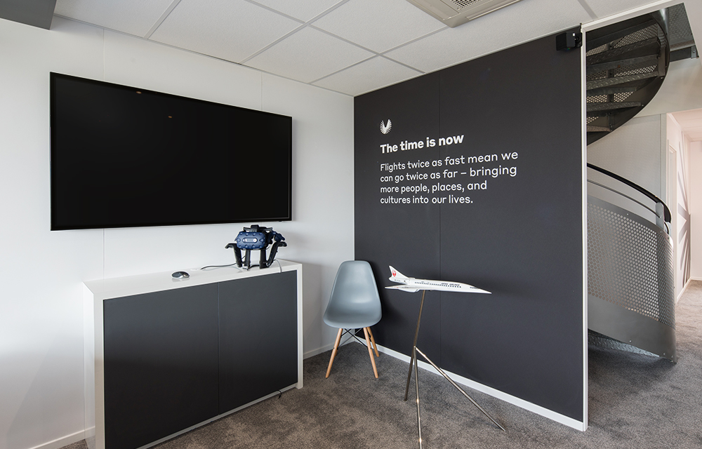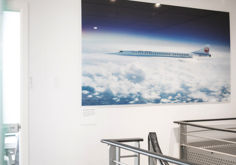 Walking into the lobby, the focal point was an impressive 3D model of XB-1, Boom’s supersonic demonstrator. It was built by the client, while we designed and constructed the strong frame required to hold it. This is an example of us working in conjunction with clients to deliver specific aspects of an overall project. Precise specifications were calculated and shared in advance so that it all came together on site.